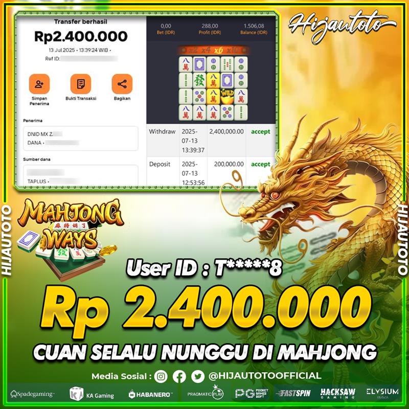 Selamat Kepada Member HIJAUTOTO T*****8 Telah Jackpot Di SLOT MAHJONG WAYS