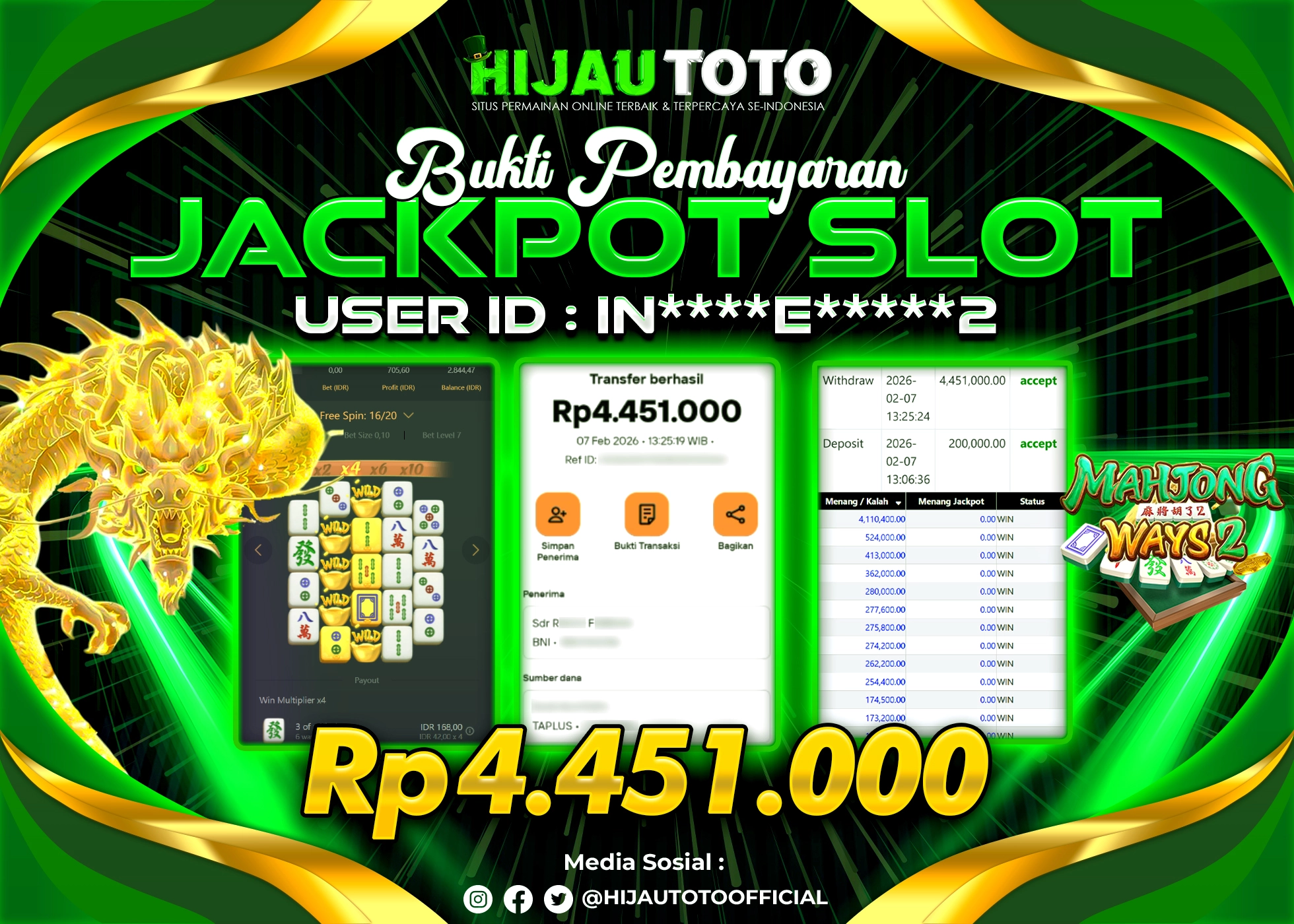 Bergabung dengan HIJAUTOTO sangat mudah dan cepat. Cukup lakukan pendaftaran dengan data lengkap, lakukan deposit minimal Rp5.000 melalui berbagai metode termasuk QRIS, dan mulai bertaruh dengan minimal taruhan Rp100. Dapatkan juga bonus new member 100% untuk modal bermain lebih besar.