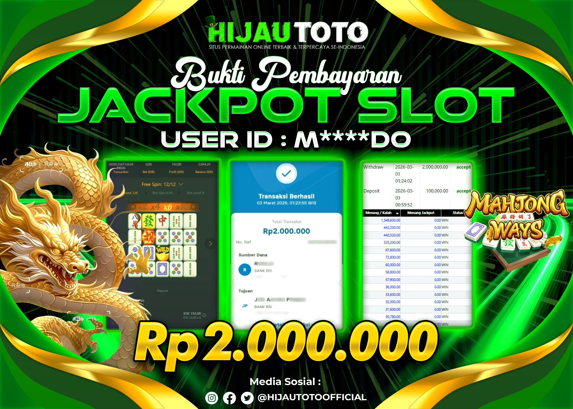 Bergabung dengan HIJAUTOTO sangat mudah dan cepat. Cukup lakukan pendaftaran dengan data lengkap, lakukan deposit minimal Rp5.000 melalui berbagai metode termasuk QRIS, dan mulai bertaruh dengan minimal taruhan Rp100. Dapatkan juga bonus new member 100% untuk modal bermain lebih besar.