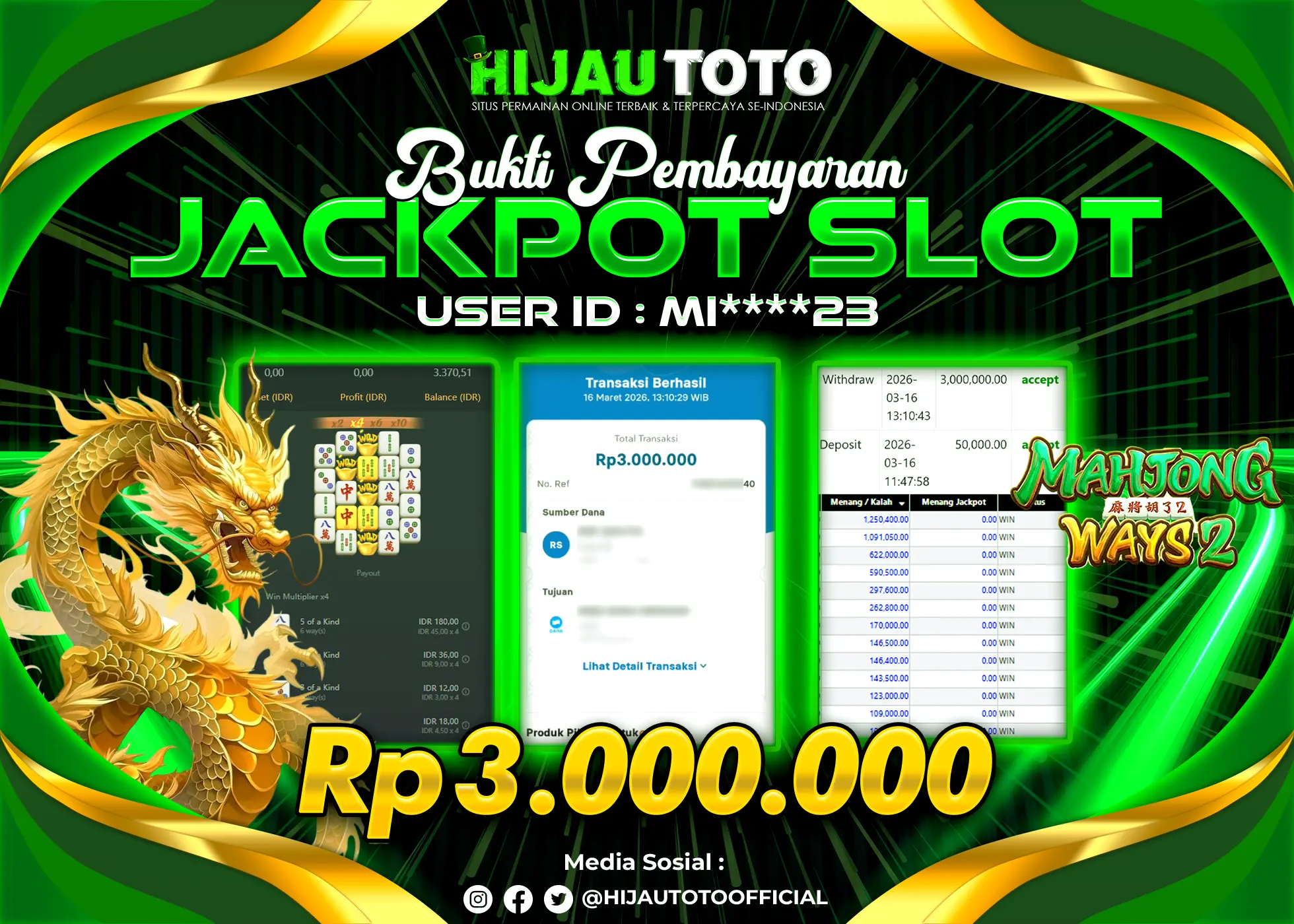Selamat Kepada Member HIJAUTOTO MI****23 Telah Jackpot Di SLOT MAHJONG WAYS 2