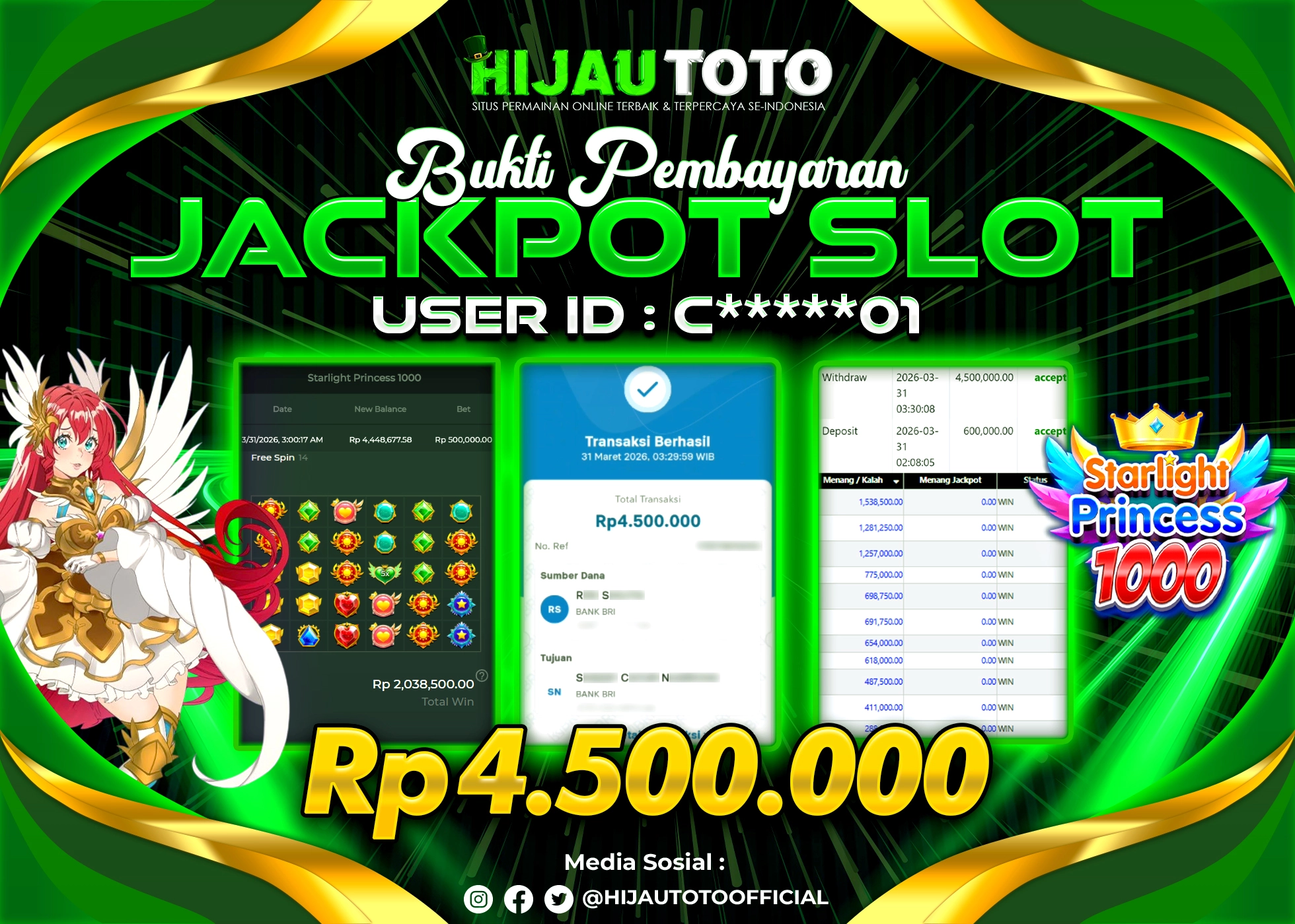 Selamat Kepada Member HIJAUTOTO C*****01 Telah Jackpot Di SLOT STARLIGHT PRINCESS 1000