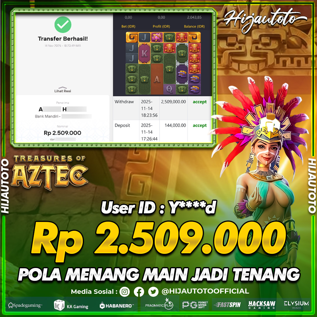 Selamat Kepada Member HIJAUTOTO Y****D Telah Jackpot Di SLOT TREASURES OF AZTEC