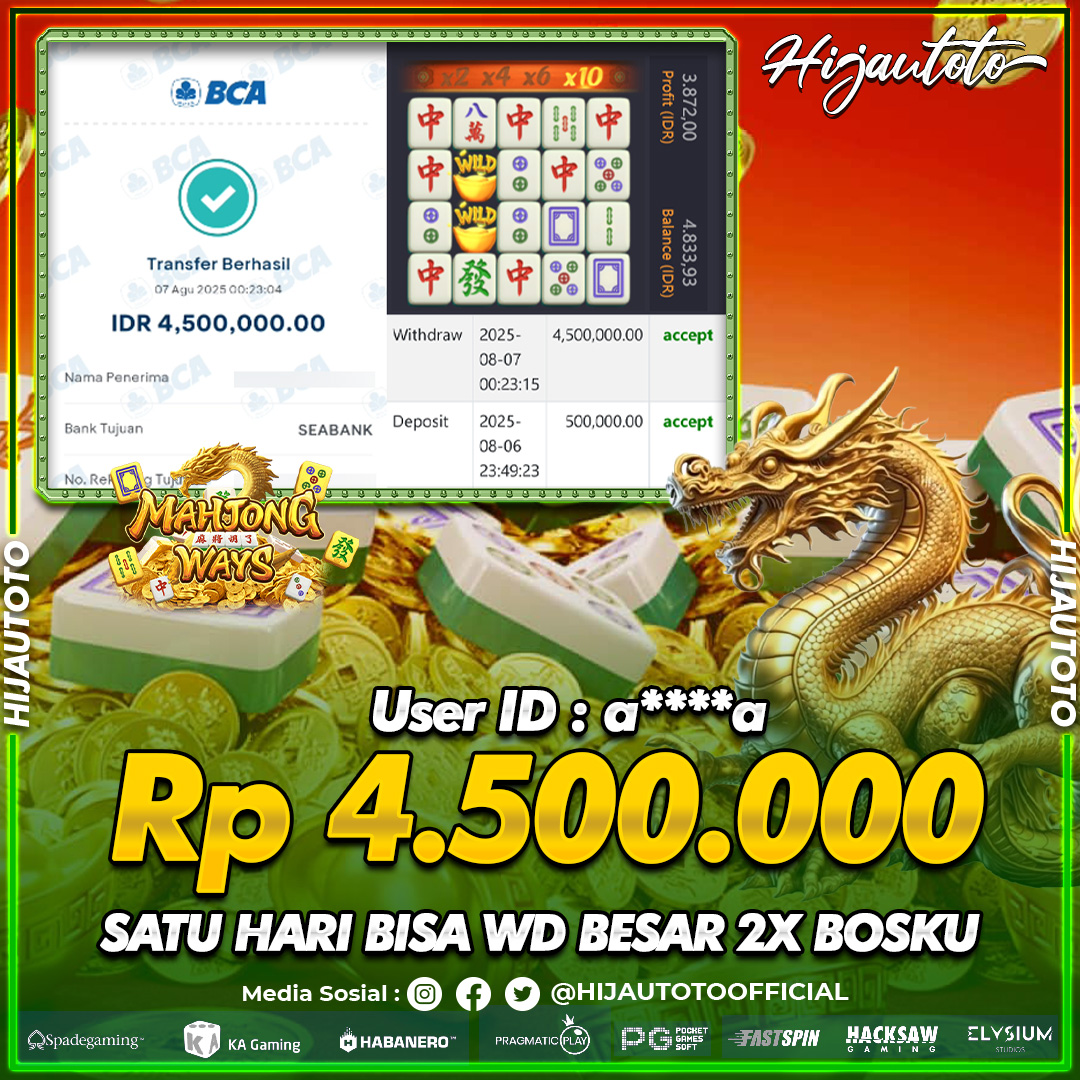 Selamat datang di HIJAUTOTO, tempatnya seru-seruan dan cuan besar! Mulai main cukup dengan modal Rp5.000 aja, taruhan super murah dari Rp100 perak! Mau main slot yang penuh warna? Atau togel dari 20 pasaran paling hits? Atau mungkin tembak ikan yang bikin deg-degan? Tenang, ada juga taruhan bola, sabung ayam, dan live casino yang bikin suasana makin hidup! Daftar sekarang dan dapetin bonus new member 100% langsung, biar modalmu makin tebal. Deposit gampang banget, bisa pakai QRIS, dan kalau butuh bantuan, customer service kita siap 24 jam nonstop. Jadi, tunggu apa lagi? Yuk, gabung dan bawa pulang kemenangannya cuma di HIJAUTOTO!