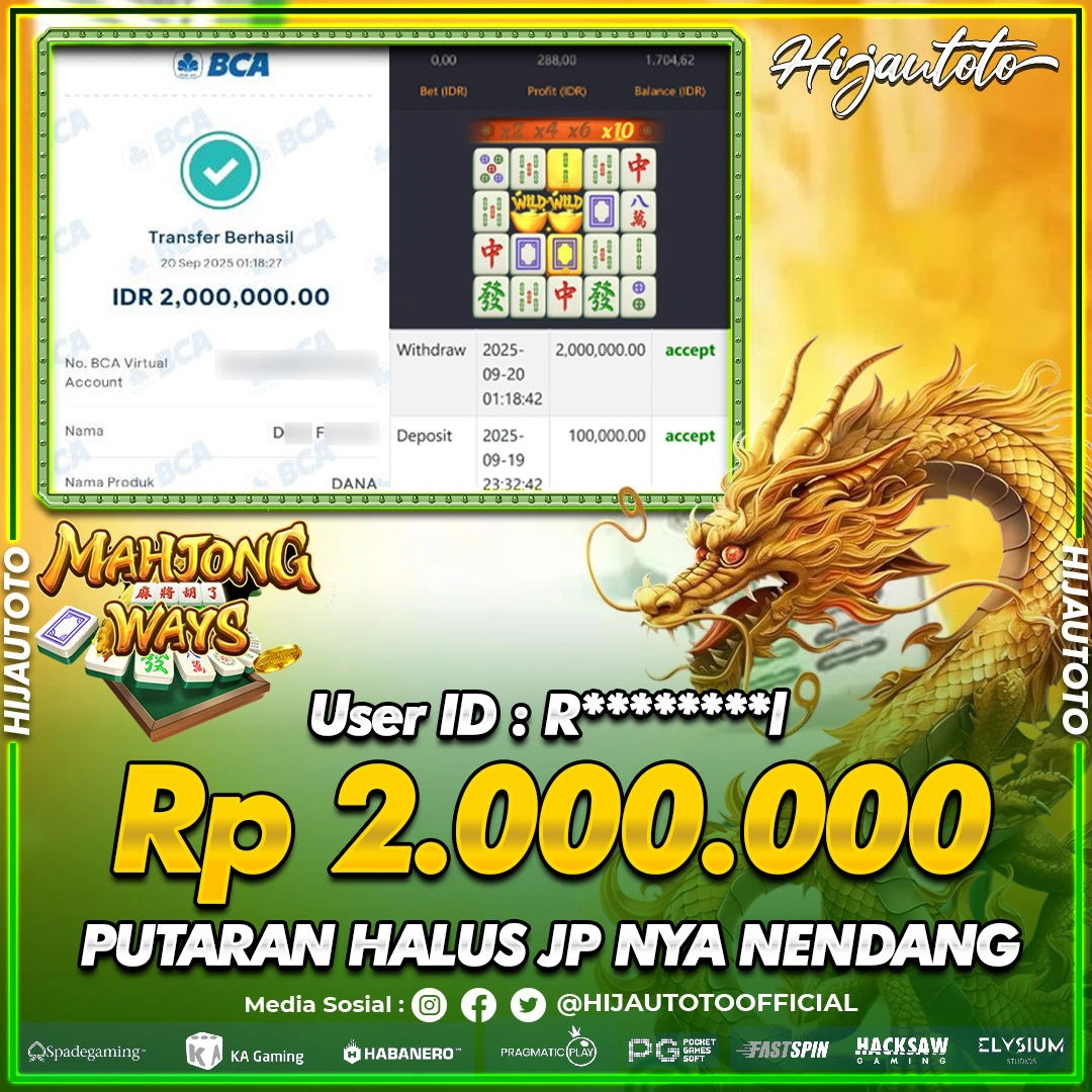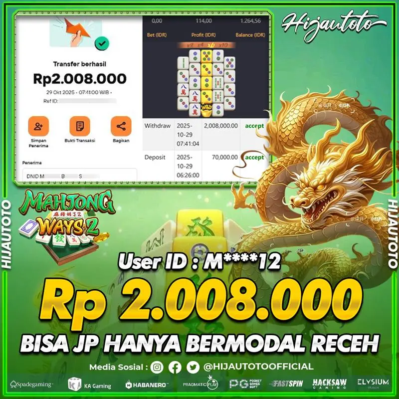 Selamat Kepada Member HIJAUTOTO R********I Telah Jackpot Di SLOT MAHJONG WAYS