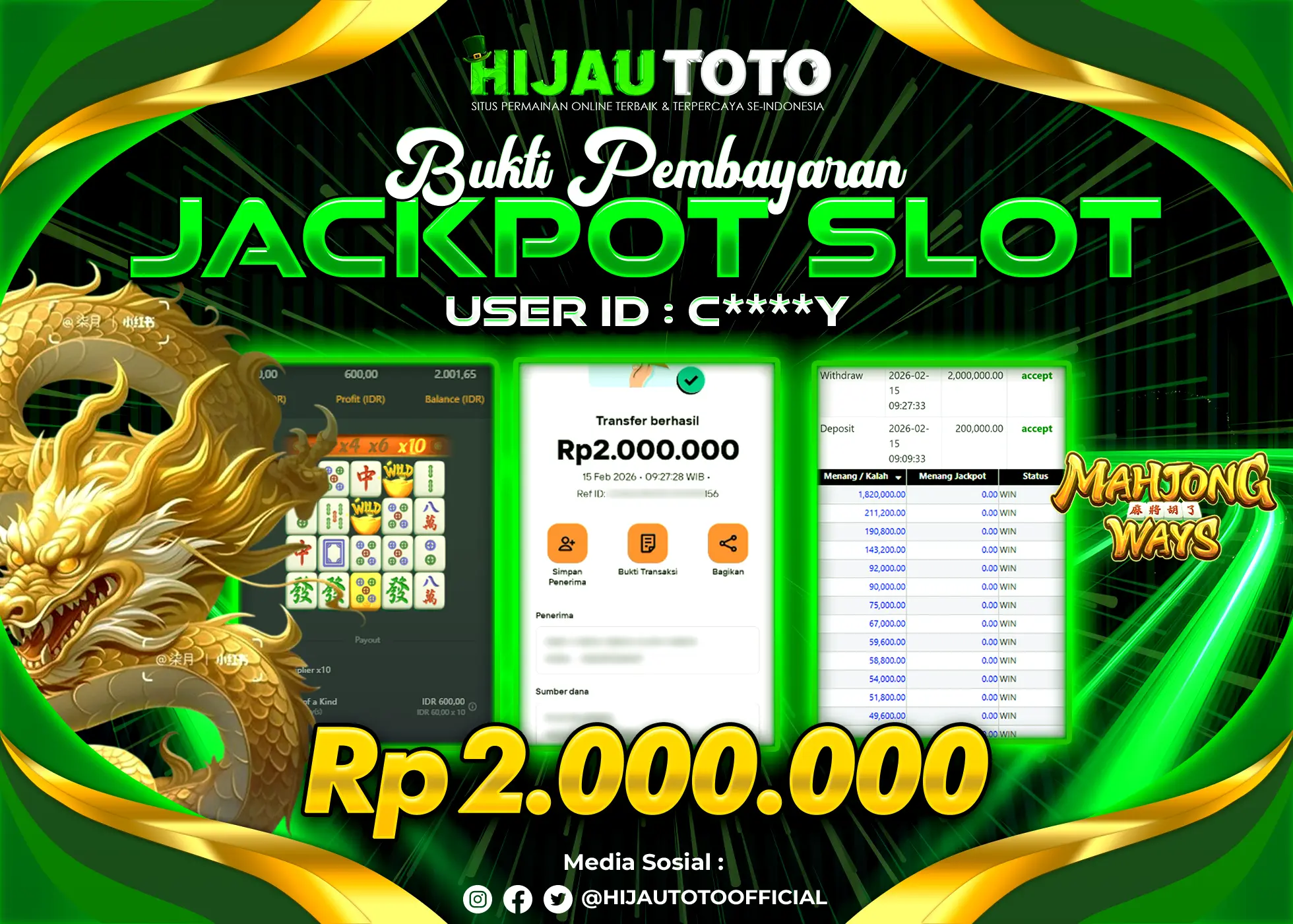 Bergabung dengan HIJAUTOTO sangat mudah dan cepat. Cukup lakukan pendaftaran dengan data lengkap, lakukan deposit minimal Rp5.000 melalui berbagai metode termasuk QRIS, dan mulai bertaruh dengan minimal taruhan Rp100. Dapatkan juga bonus new member 100% untuk modal bermain lebih besar.