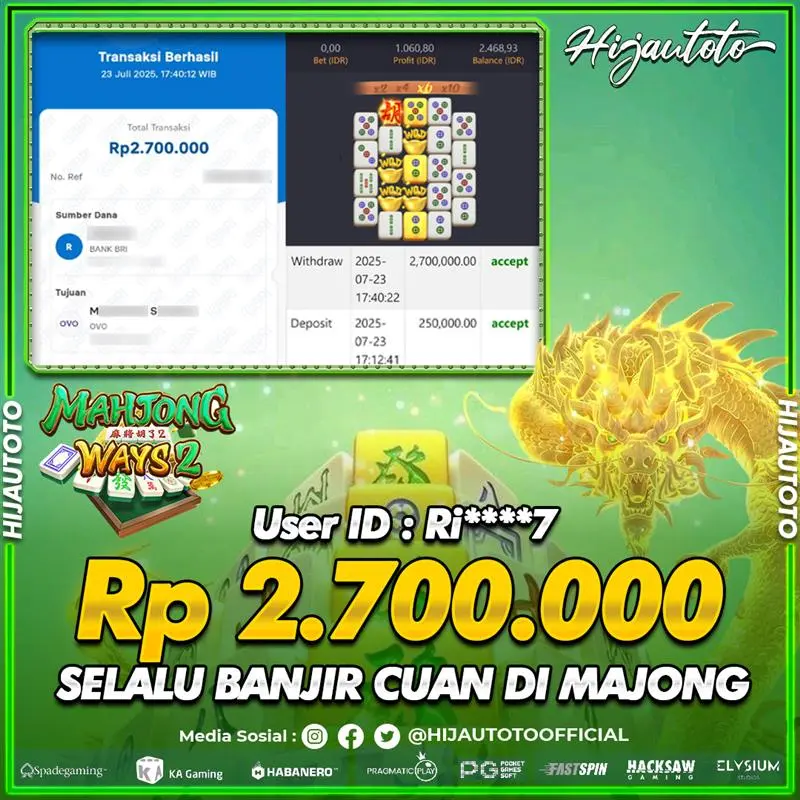 Selamat Kepada Member HIJAUTOTO RI****7 Telah Jackpot Di SLOT MAHJONG WAYS 2