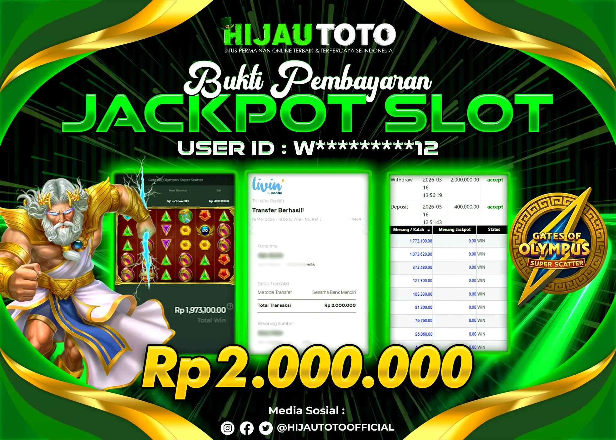 Selamat Kepada Member HIJAUTOTO CL*****99 Telah Jackpot Di SLOT GATES OF OLYMPUS
