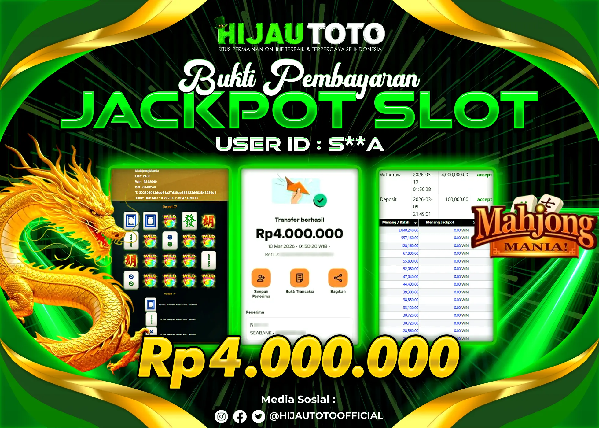 Bergabung dengan HIJAUTOTO sangat mudah dan cepat. Cukup lakukan pendaftaran dengan data lengkap, lakukan deposit minimal Rp5.000 melalui berbagai metode termasuk QRIS, dan mulai bertaruh dengan minimal taruhan Rp100. Dapatkan juga bonus new member 100% untuk modal bermain lebih besar.