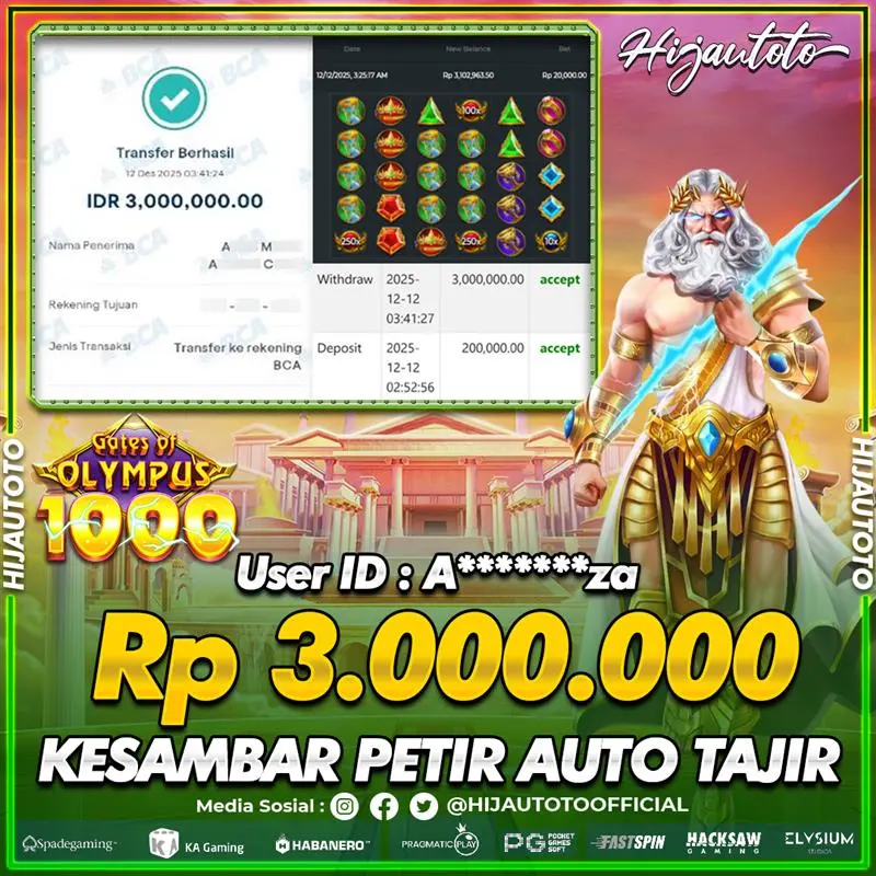 Selamat Kepada Member HIJAUTOTO A******ZA Telah Jackpot Di SLOT GATES OF OLYMPUS 1000