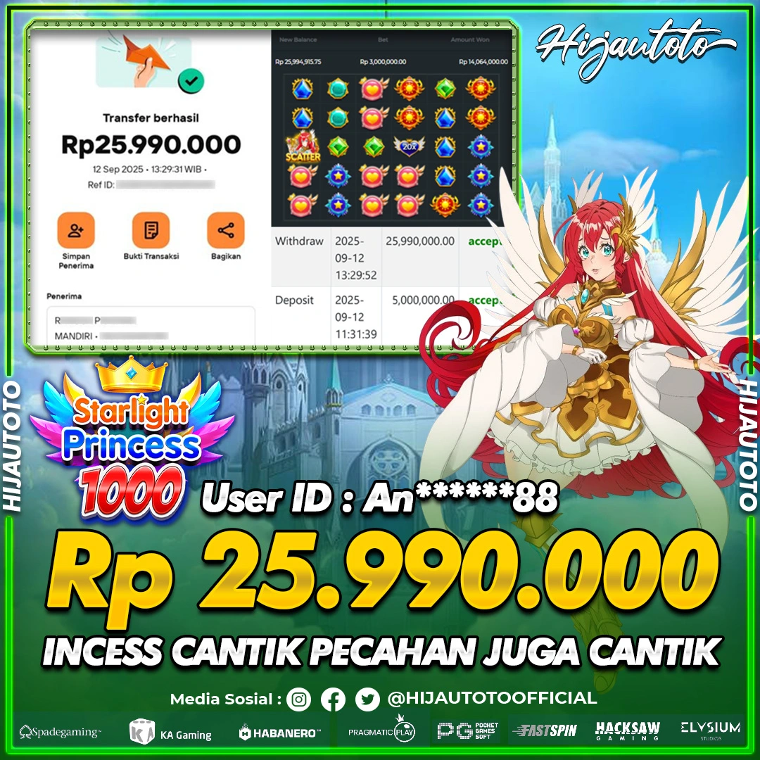 Selamat Kepada Member HIJAUTOTO AN******88 Telah Jackpot Di SLOT STARLIGHT PRINCESS 1000