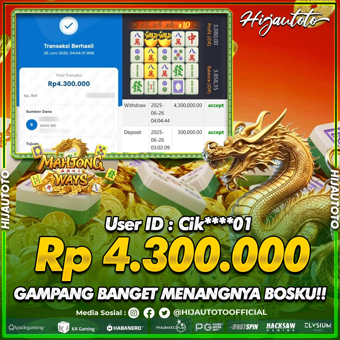 Selamat Kepada Member HIJAUTOTO CI*****01 Telah Jackpot Di MAHJONG WAYS