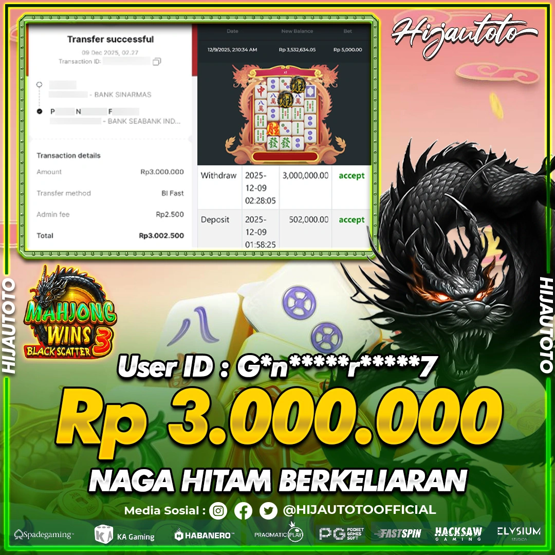 Selamat Kepada Member HIJAUTOTO R****9 Telah Jackpot Di SLOT MAHJONG WAYS 2
