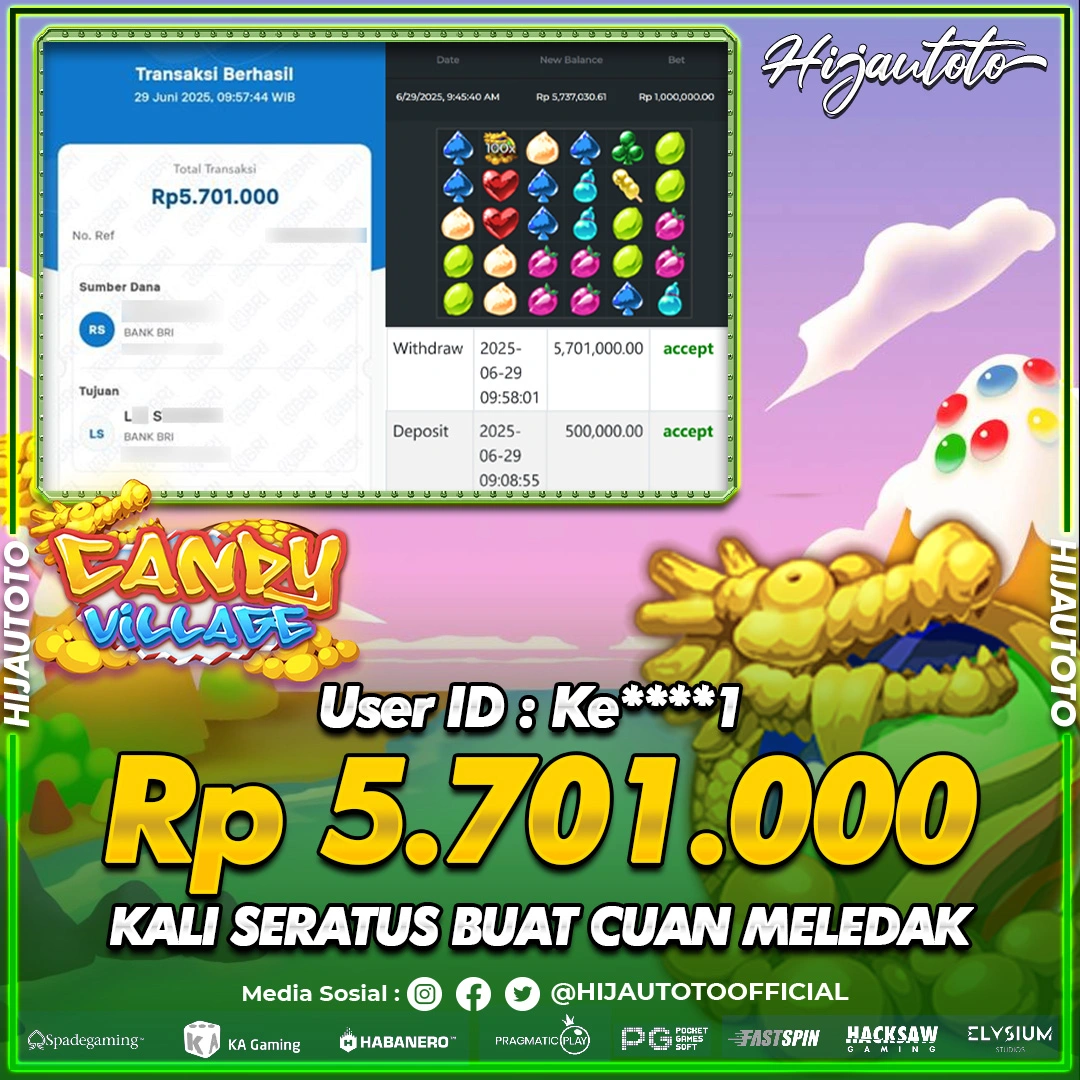 Selamat Kepada Member HIJAUTOTO KE****1 Telah Jackpot Di SLOT CANDY VILLAGE