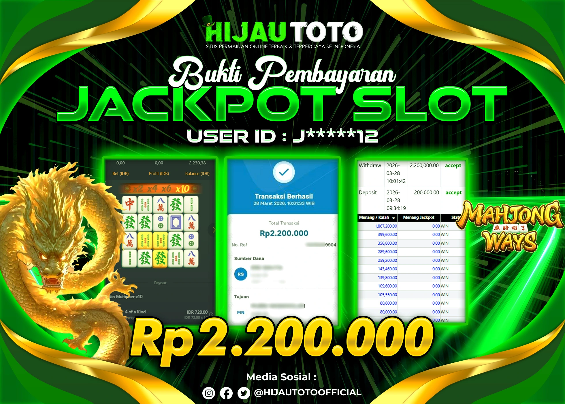 Bergabung dengan HIJAUTOTO sangat mudah dan cepat. Cukup lakukan pendaftaran dengan data lengkap, lakukan deposit minimal Rp5.000 melalui berbagai metode termasuk QRIS, dan mulai bertaruh dengan minimal taruhan Rp100. Dapatkan juga bonus new member 100% untuk modal bermain lebih besar.
