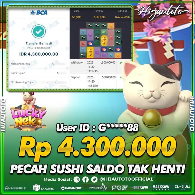 Selamat Kepada Member HIJAUTOTO G*****88 Telah Jackpot Di SLOT LUCKY NEKO