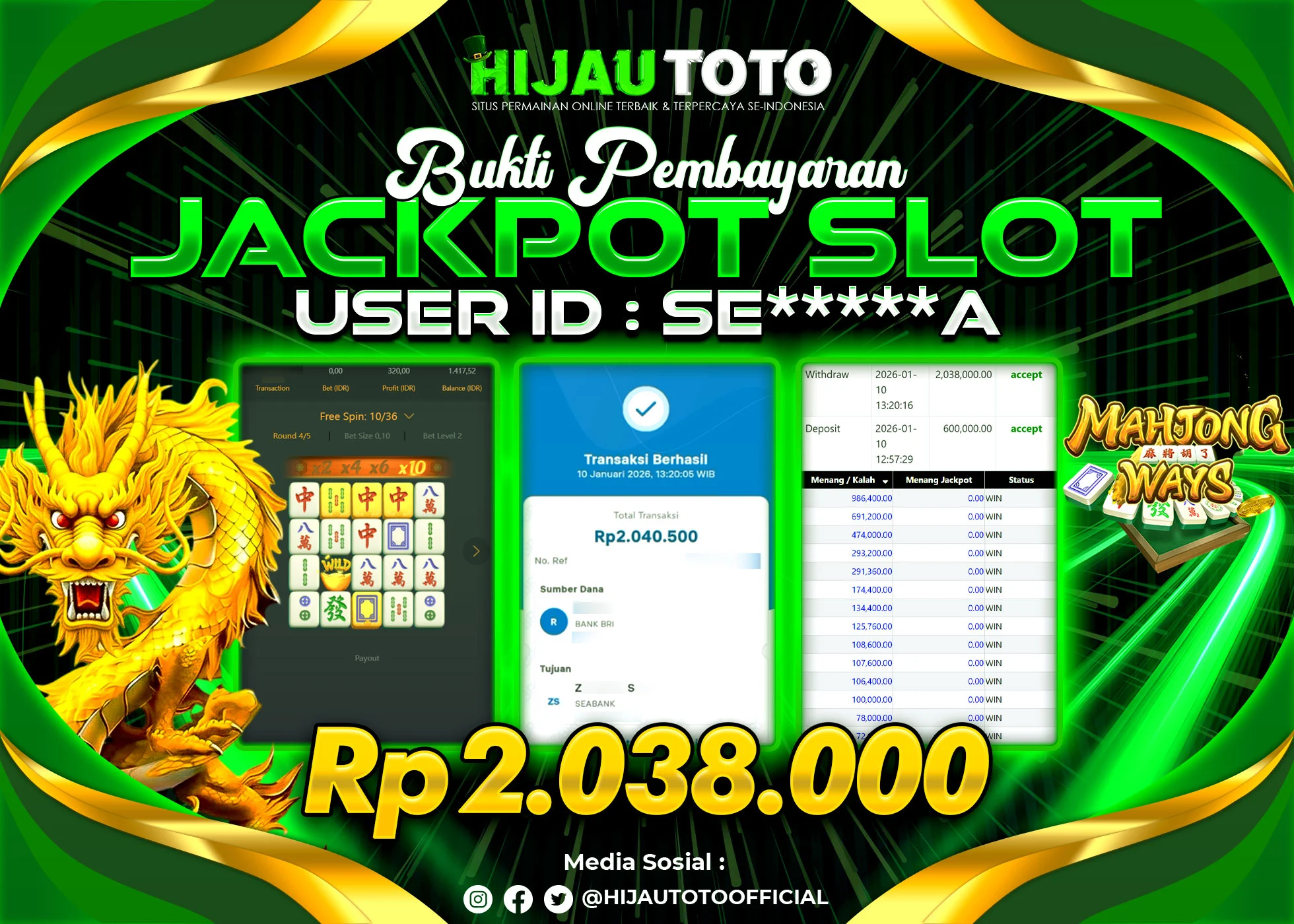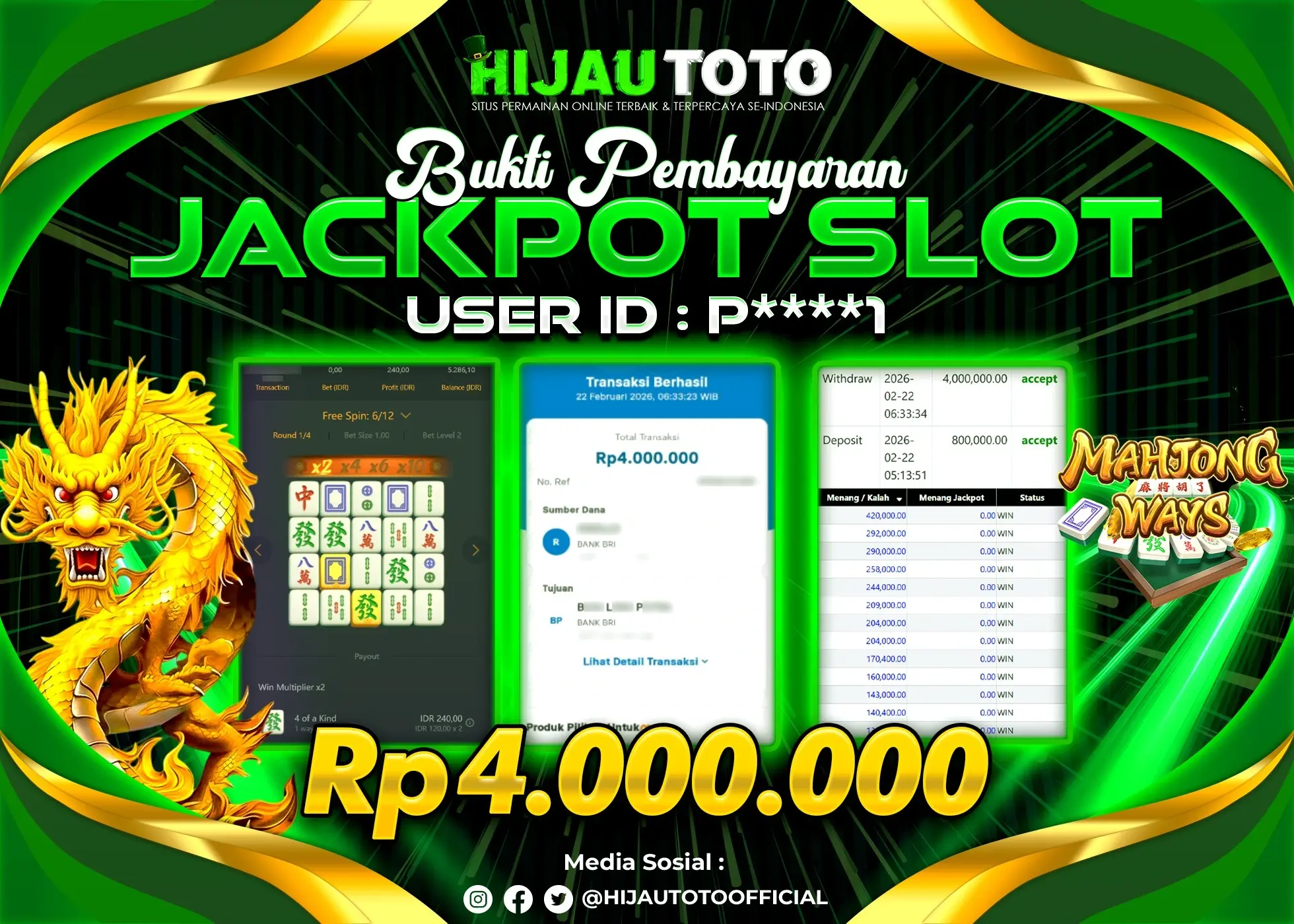 Bergabung dengan HIJAUTOTO sangat mudah dan cepat. Cukup lakukan pendaftaran dengan data lengkap, lakukan deposit minimal Rp5.000 melalui berbagai metode termasuk QRIS, dan mulai bertaruh dengan minimal taruhan Rp100. Dapatkan juga bonus new member 100% untuk modal bermain lebih besar.