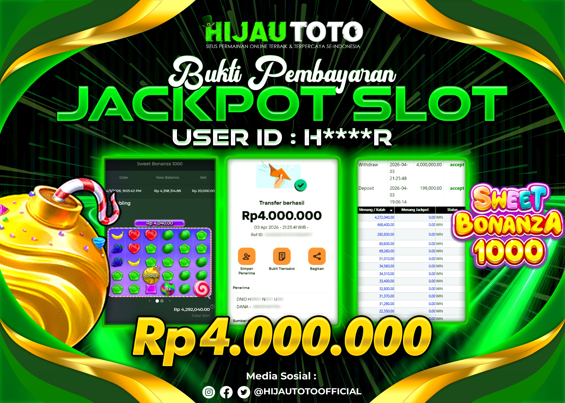 Selamat datang di HIJAUTOTO, tempatnya seru-seruan dan cuan besar! Mulai main cukup dengan modal Rp5.000 aja, taruhan super murah dari Rp100 perak! Mau main slot yang penuh warna? Atau togel dari 20 pasaran paling hits? Atau mungkin tembak ikan yang bikin deg-degan? Tenang, ada juga taruhan bola, sabung ayam, dan live casino yang bikin suasana makin hidup! Daftar sekarang dan dapetin bonus new member 100% langsung, biar modalmu makin tebal. Deposit gampang banget, bisa pakai QRIS, dan kalau butuh bantuan, customer service kita siap 24 jam nonstop. Jadi, tunggu apa lagi? Yuk, gabung dan bawa pulang kemenangannya cuma di HIJAUTOTO!
