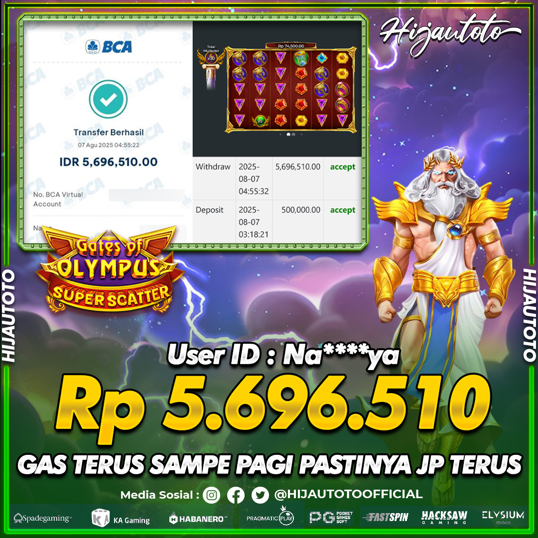 Selamat Kepada Member HIJAUTOTO NA****YA Telah Jackpot Di SLOT GATES OF OLYMPUS SUPER SCATTER