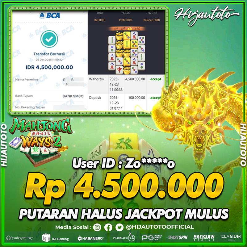 Selamat Kepada Member HIJAUTOTO ZO*****O Telah Jackpot Di SLOT MAHJONG WAYS 2