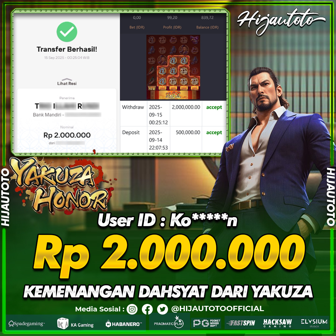 Selamat Kepada Member HIJAUTOTO KO*****N Telah Jackpot Di SLOT YAKUZA HONOR