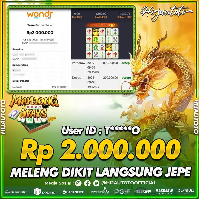Karena berhasil memenangkan Rp.Rp.2.005.000 dari permainan seru SLOT MAHJONG WAYS di HIJAUTOTO! πŸ’°πŸ’Έ