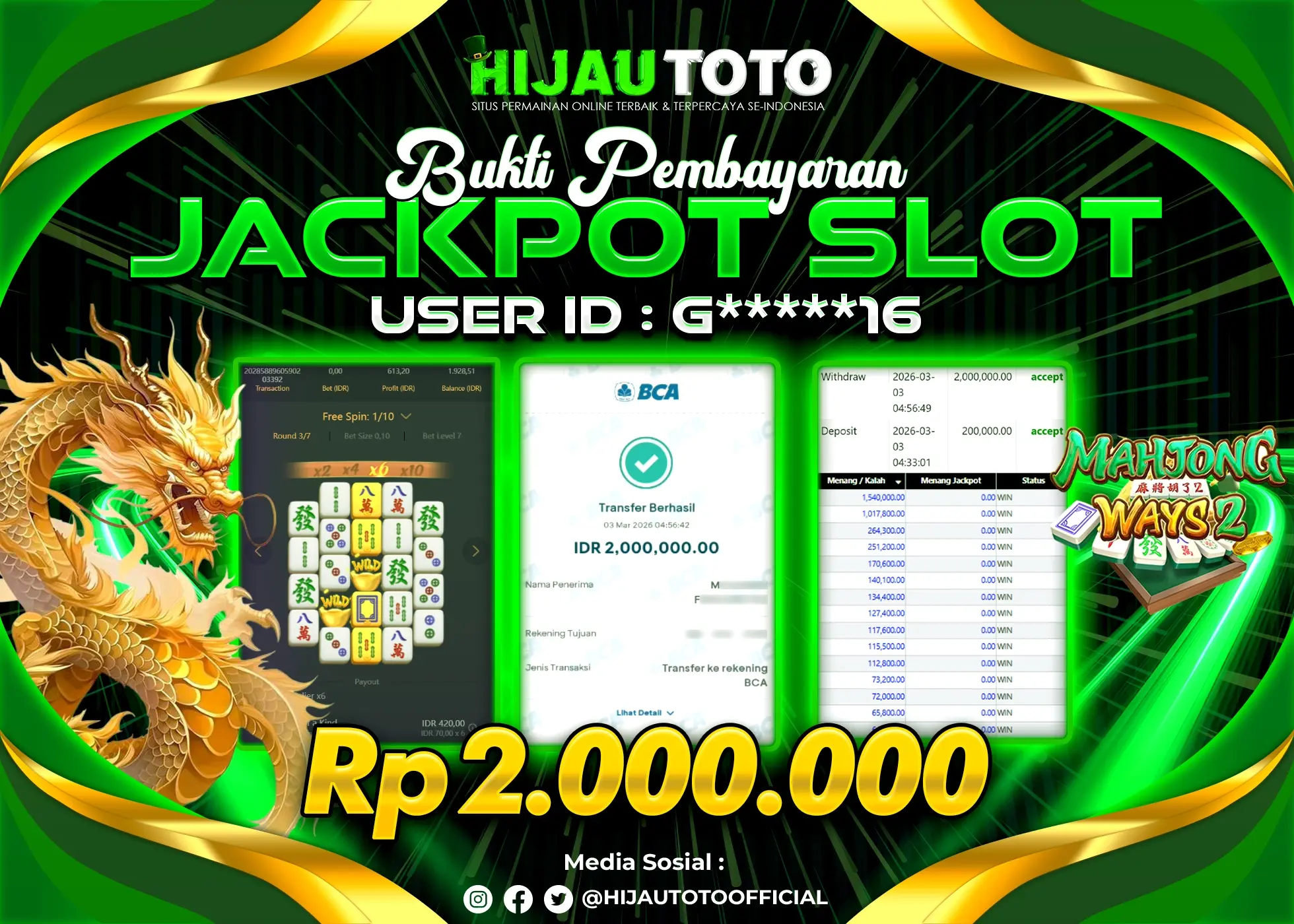 Selamat datang di HIJAUTOTO, tempatnya seru-seruan dan cuan besar! Mulai main cukup dengan modal Rp5.000 aja, taruhan super murah dari Rp100 perak! Mau main slot yang penuh warna? Atau togel dari 20 pasaran paling hits? Atau mungkin tembak ikan yang bikin deg-degan? Tenang, ada juga taruhan bola, sabung ayam, dan live casino yang bikin suasana makin hidup! Daftar sekarang dan dapetin bonus new member 100% langsung, biar modalmu makin tebal. Deposit gampang banget, bisa pakai QRIS, dan kalau butuh bantuan, customer service kita siap 24 jam nonstop. Jadi, tunggu apa lagi? Yuk, gabung dan bawa pulang kemenangannya cuma di HIJAUTOTO!