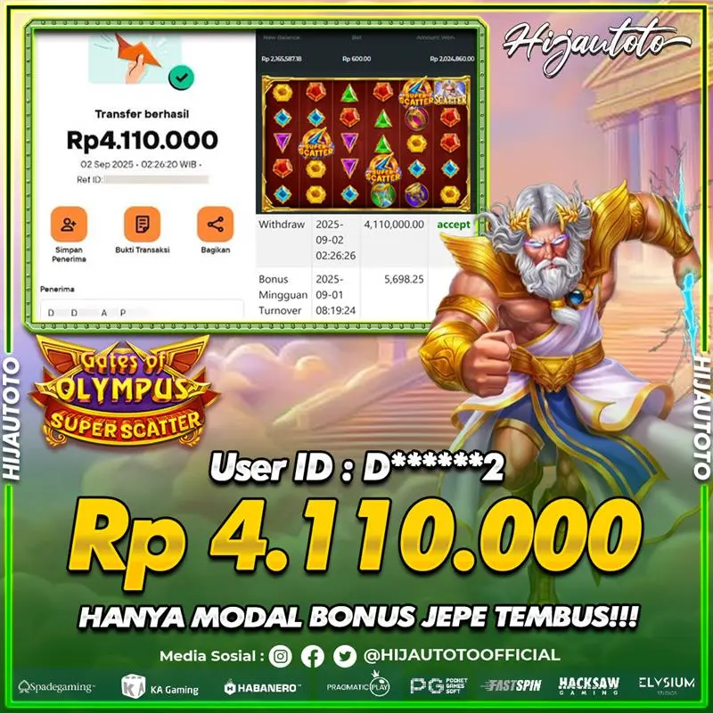 Selamat Kepada Member HIJAUTOTO D******2 Telah Jackpot Di SLOT GATES OF OLYMPUS SUPER SCATTER