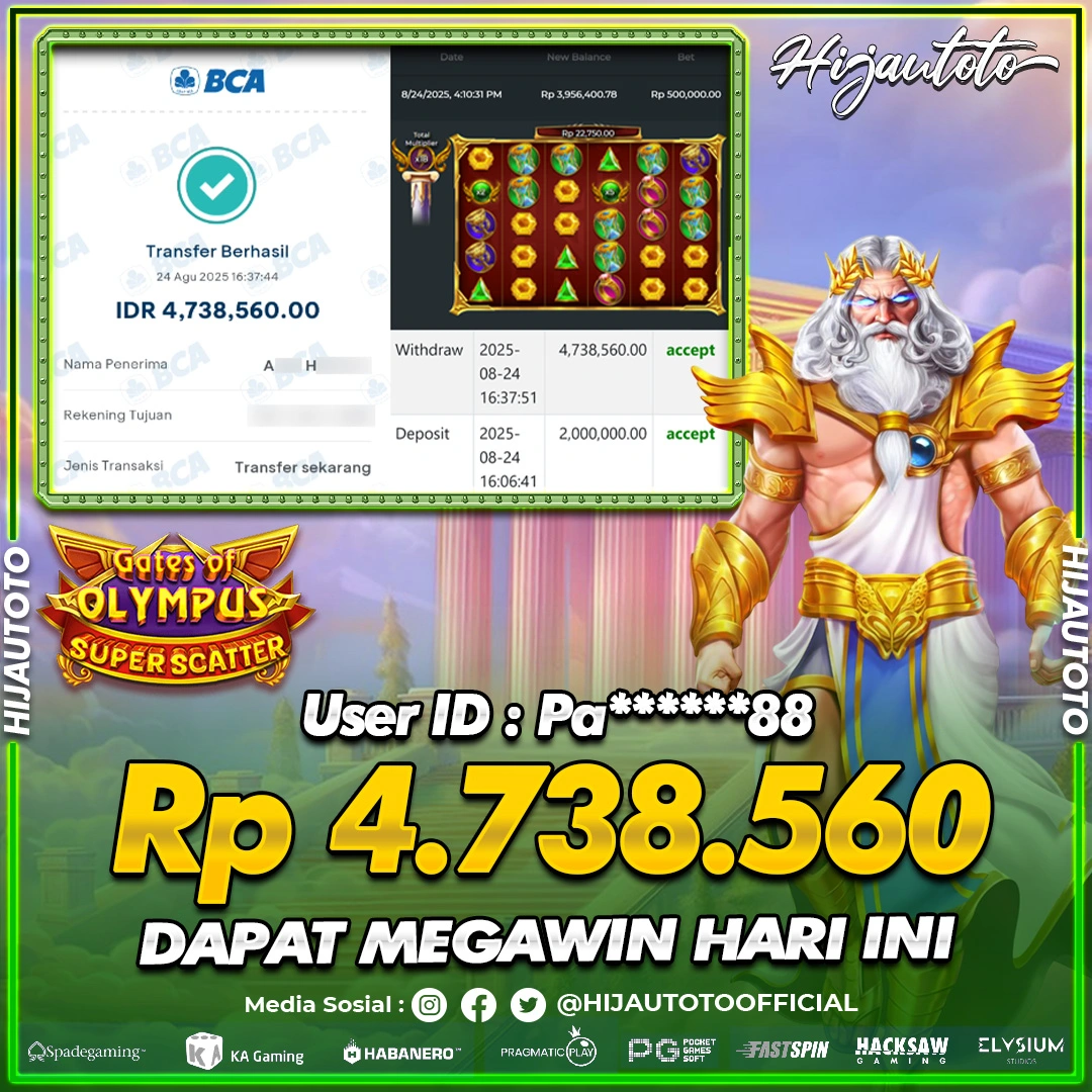 Selamat Kepada Member HIJAUTOTO PA******88 Telah Jackpot Di SLOT GATES OF OLYMPUS SUPER SCATTER