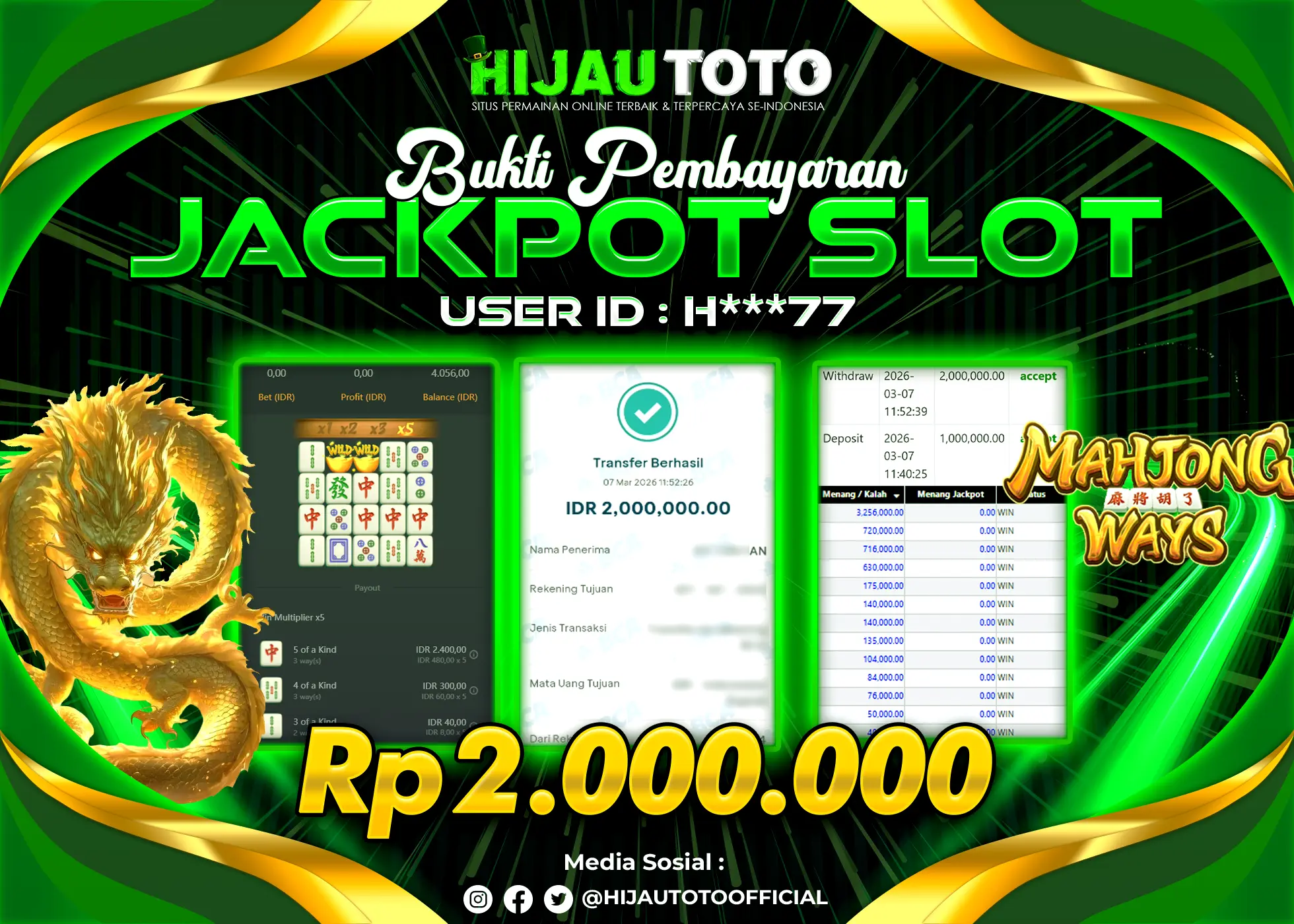 Bergabung dengan HIJAUTOTO sangat mudah dan cepat. Cukup lakukan pendaftaran dengan data lengkap, lakukan deposit minimal Rp5.000 melalui berbagai metode termasuk QRIS, dan mulai bertaruh dengan minimal taruhan Rp100. Dapatkan juga bonus new member 100% untuk modal bermain lebih besar.