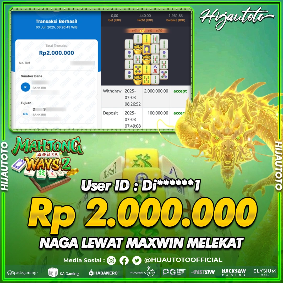 Selamat Kepada Member HIJAUTOTO DI******1 Telah Jackpot Di SLOT MAHJONG WAYS 2