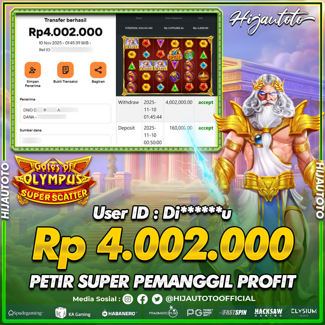 Selamat Kepada Member HIJAUTOTO DI*******U Telah Jackpot Di SLOT GATES OF OLYMPUS SUPER SCATTER