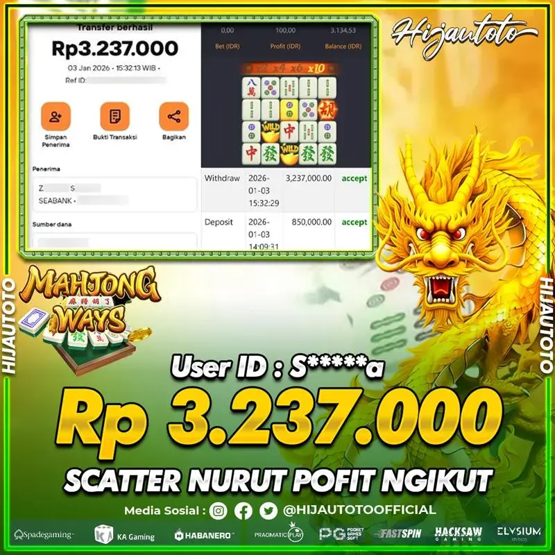 Selamat Kepada Member HIJAUTOTO S*****A Telah Jackpot Di SLOT MAHJONG WAYS