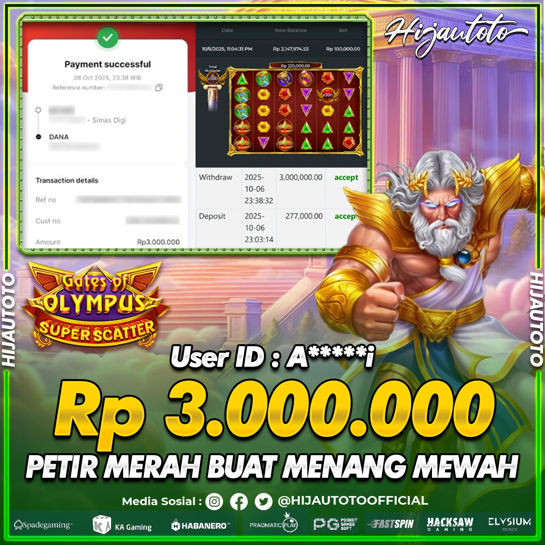 Selamat Kepada Member HIJAUTOTO K*********00 Telah Jackpot Di SLOT GATES OF OLYMPUS SUPER SCATTER
