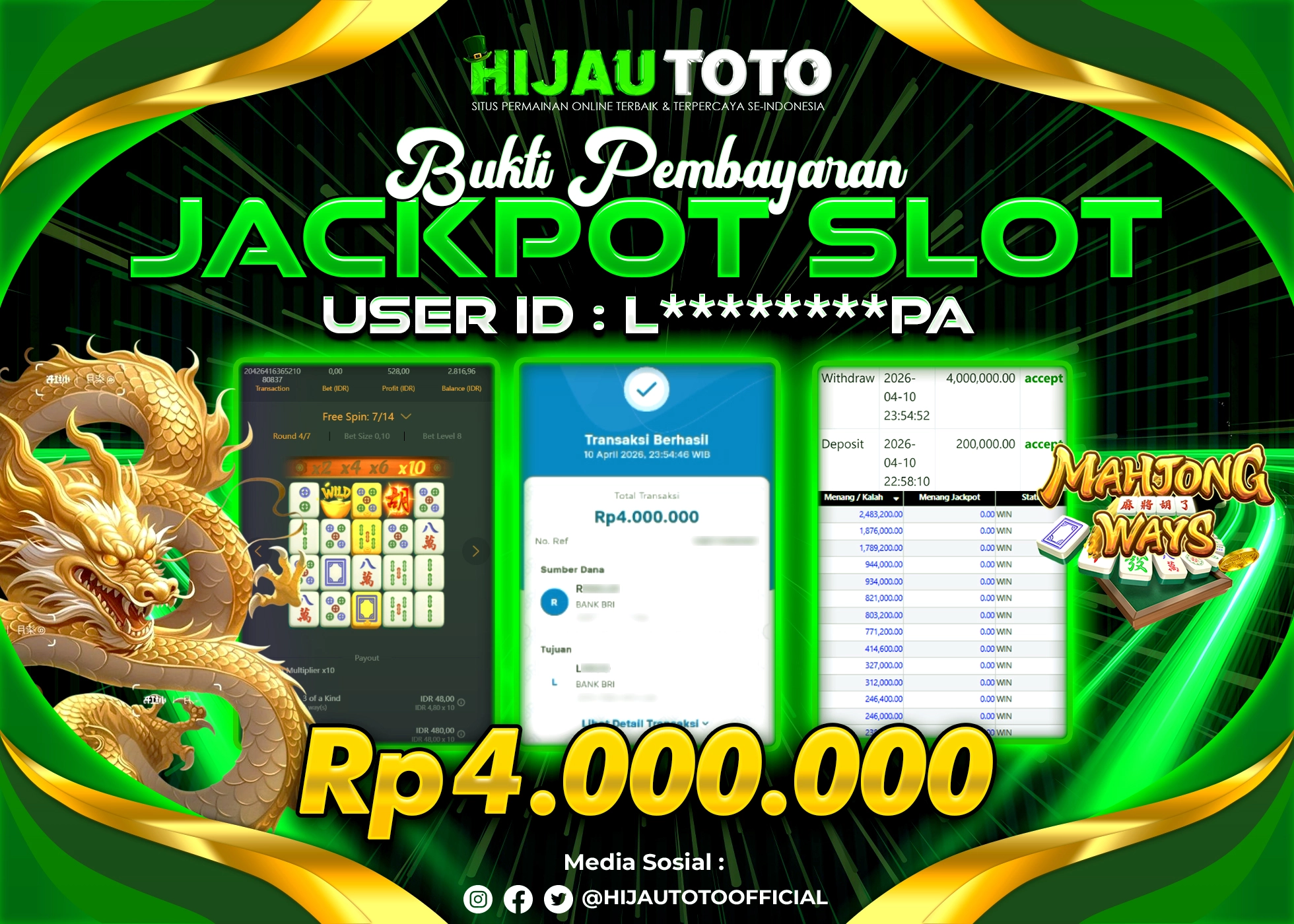 Bergabung dengan HIJAUTOTO sangat mudah dan cepat. Cukup lakukan pendaftaran dengan data lengkap, lakukan deposit minimal Rp5.000 melalui berbagai metode termasuk QRIS, dan mulai bertaruh dengan minimal taruhan Rp100. Dapatkan juga bonus new member 100% untuk modal bermain lebih besar.