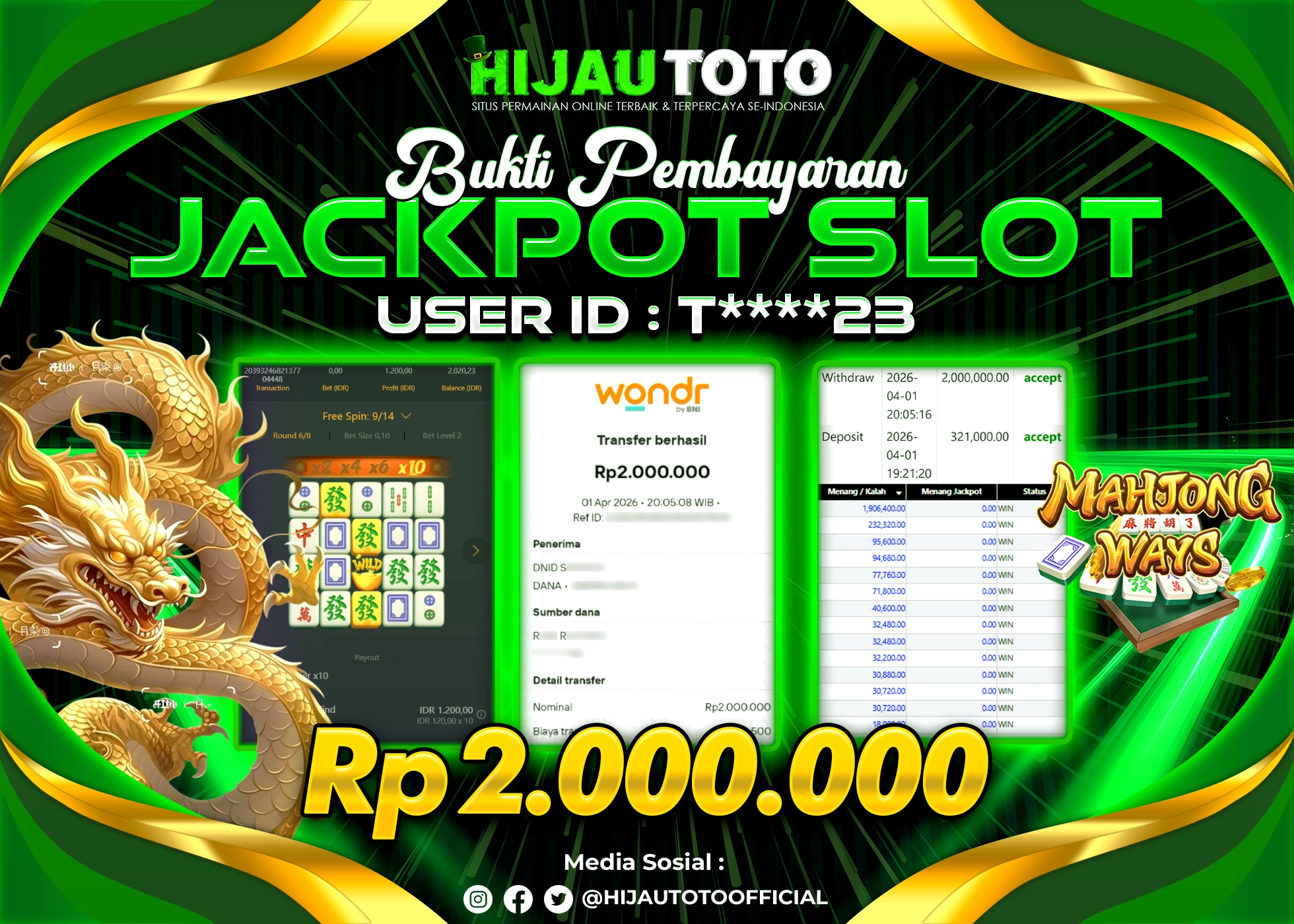 Bergabung dengan HIJAUTOTO sangat mudah dan cepat. Cukup lakukan pendaftaran dengan data lengkap, lakukan deposit minimal Rp5.000 melalui berbagai metode termasuk QRIS, dan mulai bertaruh dengan minimal taruhan Rp100. Dapatkan juga bonus new member 100% untuk modal bermain lebih besar.