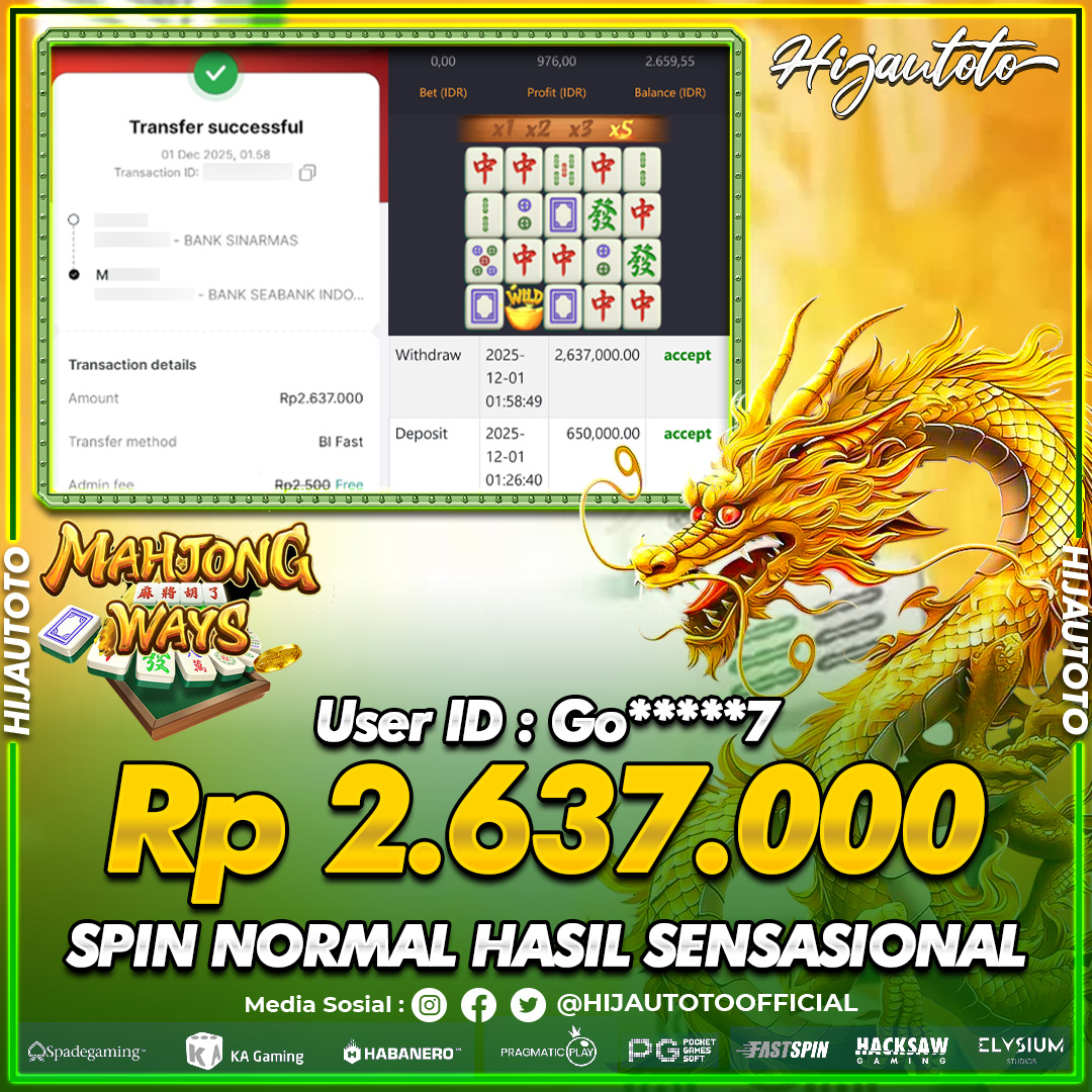 Selamat Kepada Member HIJAUTOTO GO*****7 Telah Jackpot Di SLOT MAHJONG WAYS