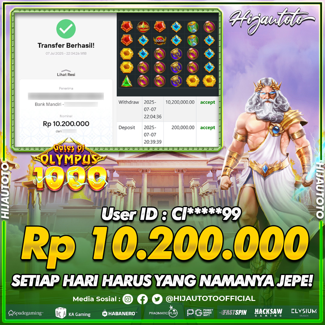 Selamat Kepada Member HIJAUTOTO CL*****99 Telah Jackpot Di SLOT GATES OF OLYMPUS 1000