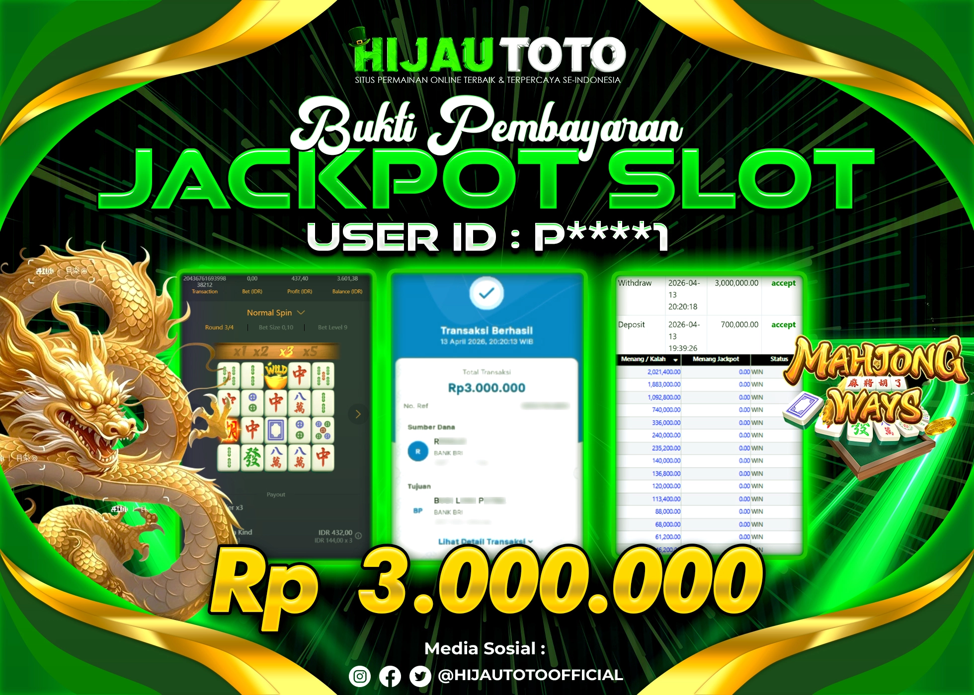 Karena berhasil memenangkan Rp.Rp.2.920.000 dari permainan seru SLOT MAHJONG WAYS di HIJAUTOTO! πŸ’°πŸ’Έ
