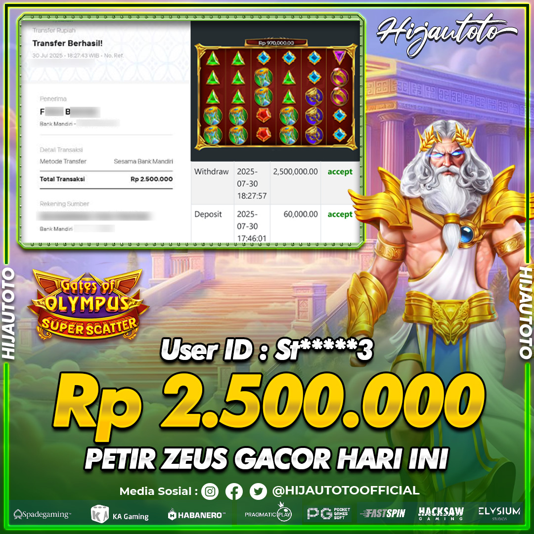 Selamat Kepada Member HIJAUTOTO ST*****3 Telah Jackpot Di SLOT GATES OF OLYMPUS SUPER SCATTER