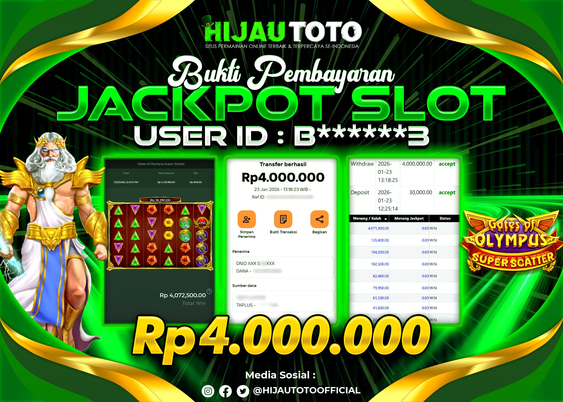 Selamat Kepada Member HIJAUTOTO B******3 Telah Jackpot Di SLOT GATES OF OLYMPUS SUPER SCATTER
