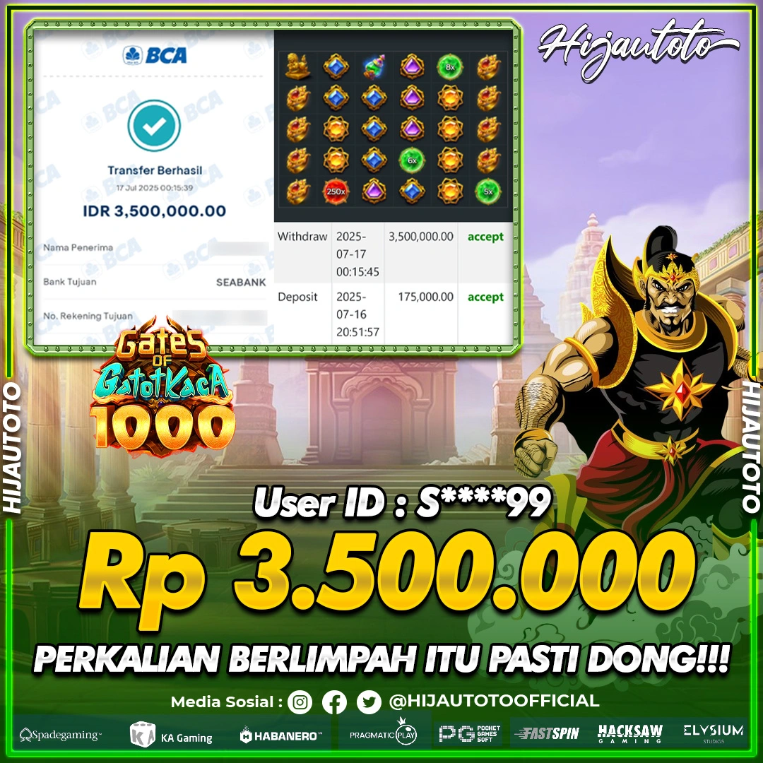 Selamat Kepada Member HIJAUTOTO S*****9 Telah Jackpot Di SLOT GATES OF GATOTKACA 1000